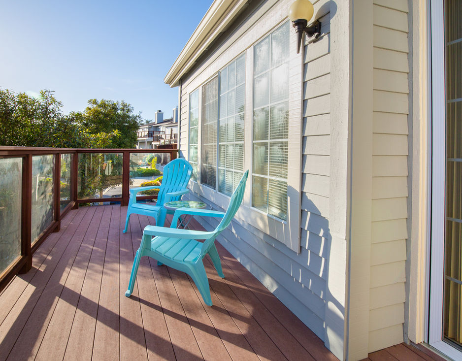 The warm hardwood floors, high ceilings, and abundant natural light create an inviting atmosphere throughout the space. The cozy living area opens onto a Trex deck, perfect for relaxing or enjoying al fresco dining.